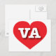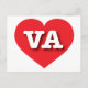 Cette carte postale est dotée d'un coeur rouge vif contenant les lettres coques en haut, blanches et audacieuses VA, l'abréviation officielle de Virginie, l'État du Vieux Dominion. Le verso de la carte postale est vide, en attendant votre texte customisé ou vos sentiments manuscrits.