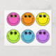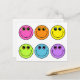 Cette carte postale présente des visages émoji en rose, orange, jaune, vert bleu et violet avec différents yeux colorés et de grands sourires heureux.