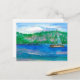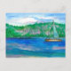 Carte postale ornée d'un voilier naviguant sur un lac de montagne paisible et d'un autre bateau amarré près du rivage avec des montagnes recouvertes d'arbres. Inspiré par la rive nord du lac Tahoe peint en aquarelle.