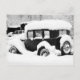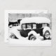 Photo en noir et blanc d'une voiture d'époque en neige.
