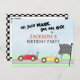 Cette invitation d'anniversaire de voiture de course amusante comprend l'invitation d'anniversaire des enfants mignon moderne, avec une piste de course colorée amusante, sur votre marque se mettre en place, aller dessin animé simple cool, simple moderne minimaliste garçon, course rouge derby jaune, course sur voitures, garçons course voiture enfants en bas âge, avec à damiers drapeau vitesse minime, tendance stylisé enfants dessin graphique