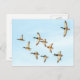 Dix canards colverts volent en formation à travers un ciel bleu vif.