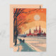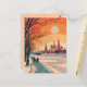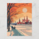 Cette carte postale de voyage présente une illustration sereine et chaleureuse représentant le paysage urbain de Moscou avec des monuments historiques qui s'élèvent derrière un vaste parc enneigé. C'est une carte postale pour les voyageurs qui ont l'intention de visiter Moscou ou pour ceux qui ont voyagé à Moscou et d'envoyer une carte postale à leur famille ou à leurs amis.