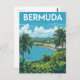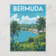 Une affiche vibrante de style voyage mettant en valeur un paysage bermudien époustouflant. L'œuvre d'art présente une baie panoramique bordée de bâtiments aux toits blancs et de collines verdoyantes, le tout vu à travers un premier plan de plantes tropicales et de feuilles de palmier. L'eau claire et turquoise et les nuages duveteux évoquent une journée parfaite au paradis.
