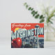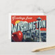Discover the Evergreen State with this vibrant, retro "Greetings from Washington" postcard. This classic large-letter design features iconic Seattle landmarks like the Space Needle and skyline, the majestic Mount Rainier, and a large red apple representing the state's significant produce. This vintage travel art is perfect for Washington residents, Seattle fans, apple growers, mountain lovers, and collectors of Americana state souvenirs. Send a unique piece of nostalgia or display it as framed art.