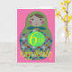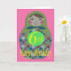 Carte de 6ème anniversaire avec l'image d'une poupée russe de forme classique avec des cercles colorés, sur un arrière - plan rose.
