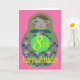 Carte du 8ème anniversaire avec l'image d'une poupée russe de forme classique avec des cercles colorés, sur un arrière - plan rose.