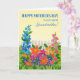 Une très jolie carte de fête des mères pour votre grand-mère, avec un parterre de fleurs aux couleurs vives, réalisée à partir d'un collage de papier peint à la main. Les fleurs sont grandes et petites, rouges, roses, orange et nuances de bleu, avec une clôture blanche derrière elles, sur un fond jaune ensoleillé. Le message de la couverture avant en lettrage bleu foncé, est 'Joyeuse fête des mères à une grand-mère très spéciale !' Le message à l'intérieur est juste une suggestion et vous pouvez facilement le modifier ou le supprimer si vous le souhaitez.
