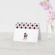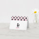Un carte pour notes comportant un motif à motifs de losanges rose et noir à travers le dessus de l'avant. Illustration de caniche noir avec le collier et l'arc roses en bas. Le texte rose sous le caniche indique "Bonjour !"
