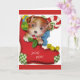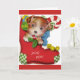 L'image adorable et vintage d'un chiot dans un bas avec un sucre de canne et des cadeaux est présentée sur la carte de Noël de ce bébé. Avant de la carte dit, "Pour vous", et à l'intérieur de la carte dit, "Que votre premier Noël soit plein de bonheur et de merveilleuses surprises aussi! Un Joyeux Noël plein d'amour est ce que je vous souhaite !".