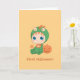 Bébé adorable habillé d'un costume de dragon vert avec des pointes orange et un bib orange assorti au crâne. Un citrouille incurvé se trouve juste un peu derrière. Texte personnalisable.