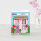 Illustration simple d'une maison rose décorée de ballons en forme de coeur et de bruants. Il y a un avion qui survole la maison qui a une bannière derrière, qui dit "Heureux premier Saint Valentin en couple à une fille et un gendre spéciaux".
