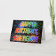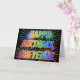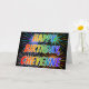 Cette carte de voeux d'anniversaire multicolore et amusant présente le message "HAPPY BANTHDAY", et le prénom commun "CHEYENNE" avec les lettres ayant un spectre arc-en-ciel coloré comme motif de couleur dégradé. L'arrière - plan du devant présente également un motif coloré inspiré par l'apparition de feux d'artifice éclatants. L'intérieur comporte un message de salutation customisé, ou peut-être pourrait-il être effacé et laissé vide si un message doit être écrit à la main à la place. Une telle carte de voeux pourrait être une façon amusante de reconnaître l'anniversaire de quelqu'un nommé Cheyenne. [~Z0000350]