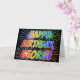 Ce design amusant, vibrant et multicolore de cartes de voeux d'anniversaire comprend le message "HAPPY BANTHDAY", et le prénom commun "GEORGE" avec les lettres ayant un spectre arc-en-ciel coloré comme motif de couleur dégradé. L'arrière - plan du front présente également un motif coloré inspiré par l'apparition de feux d'artifice festifs éclatants. L'intérieur comporte un message de salutation personnalisable, ou peut-être peut-être être effacé et laissé vide si un message doit être écrit à la main à la place. Une telle carte de voeux pourrait être une façon amusante de célébrer l'anniversaire de quelqu'un du nom de George. [~Z0000350]