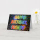 Ce design amusant, vibrant et multicolore de cartes de voeux d'anniversaire comprend le message "HAPPY BANTHDAY", et le prénom commun "RANDY" avec les lettres ayant un spectre arc-en-ciel coloré comme motif de couleur dégradé. L'arrière - plan du devant présente également un motif coloré inspiré par l'allure d'un feu d'artifice festif. L'intérieur comporte un message d'accueil personnalisé, ou pourrait être effacé et laissé vide si un message doit être écrit à la main à la place. Une carte de voeux comme celle-ci pourrait être une façon amusante d'envoyer un message d'anniversaire personnalisé à quelqu'un nommé Randy. [~Z0000350]