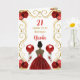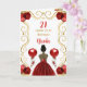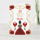 Cette invitation à la carte d'anniversaire comporte un cadre doré élégant, une belle princesse à la peau foncée et une robe rouge, des fleurs et un ballon.