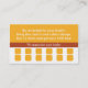 Carte Punch Carte de visite Loyauté avec 12 porte-poinçons/tampons au dos de la carte. Entièrement personnalisable et modifiable. Entrez dans votre offre de récompenses d'entreprises dans l'espace prévu. Parfait pour un restaurant pizzeria, pizzeria, bagel shop, hot dog stand, épicerie, sandwich shop, ou food truck.