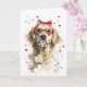 Un joli récupérateur d'or orné de lunettes en forme de coeur et d'un arc rouge vif, tenant une sucette sucre de canne, entouré de coeurs rouges épars. Parfait pour envoyer des voeux chaleureux et ludiques pour la Saint-Valentin.