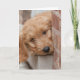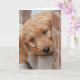 Un adorable Goldendoodle de onze semaines aux yeux brillants sort curieusement d'une porte en brique