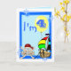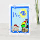 Carte de 4ème anniversaire avec un drôle de pirate et de bateau, clown, pingouin et ballons, sur un arrière - plan bleu. Personnalisez facilement ce design en ajoutant ou en modifiant le texte.