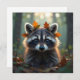 Un adorable raton laveur assis dans une forêt à automne couvert automne laisse une carte blanche.