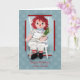 Vintage rag doll with daisy bouquet in slit corner red frame for birthday. Customize card with any name.
