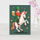 Designed with a festive, storybook look, the card shows a smiling leprechaun riding a rearing white unicorn at the center of the scene. He wears emerald green clothes and a tall green hat, his orange beard framing a grin as he lifts a frothy pint like a toast shared with a close friend 💚. The unicorn’s bright blue eyes and golden spiral horn catch the light, while its rainbow mane and tail sweep upward in flowing strands 🌈. Behind them, a deep teal-green backdrop is sprinkled with small golden shamrocks and soft, pale green stars, like confetti floating in night air. The leprechaun leans forward with an easy confidence, and the unicorn’s lifted front legs add a lively, celebratory energy to their partnership. A St. Patrick’s Day greeting sits near the top in light gold lettering, with smaller words tucked beneath in pale green for contrast. Golden shamrocks dot the corners, and the rainbow mane arcs across the right side while the unicorn’s tail curls along the lower edge.