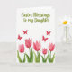 Designed with a fresh spring look, this card features the message “Easter Blessings to my Daughter” set along the top in olive-green lettering with a smooth, flowing style. Beneath the words, four small red butterflies drift across the white space, their wings angled as if they’re circling one another in a friendly little dance 🐇. The open background keeps the focus on their bright crimson color and the sense of motion between them. Along the bottom, five tulips bloom in soft rosy pink, with petals shaded from pale blush to deeper rose as if leaning close together like a gentle family cluster 🌷. Green stems rise up from the base, joined by wide leaves that overlap and curve outward to frame the flowers. The layout feels balanced, with the text at the top, butterflies in the upper half, and the tulips anchoring the lower edge. The white backdrop stays untextured and airy, while the butterflies remain a clear red accent above the pink tulips and green leaves.