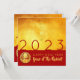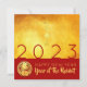 Design moderne avec papier texturé doré (image imprimée) avec grand 2023 en rouge + petit rond Tiger coupé en papier avec des textes jaunes BONNE ANNÉE et Année du lapin sur un arrière - plan rouge en face + textes pour la fête du Nouvel An chinois à customiser en arrière avec le même arrière - plan. Conception sur carte d'invitation à plat carré. Carte de voeux, carte postale de vacances et plus encore... Parfait pour un Nouvel An chinois moderne et intemporel du lapin 2023.