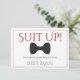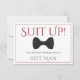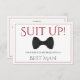 Utilisez cette "carte de proposition du meilleur homme" pour demander à votre ami spécial, frère ou autre membre de la famille d'être le meilleur homme de votre mariage. Il présente une image d'une cravate arc-en-ciel noire sur un arrière - plan blanc avec texte rouge et gris : Suit Up! Vos services sont demandés en tant que meilleur homme" Il y a un espace pour entrer une note spéciale demandant "serez-vous mon meilleur homme?" ainsi que les noms du couple mariage et la date du mariage. Tous les champs sont entièrement personnalisables.