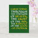L'ancienne prière catholique irlandaise connue sous le nom de "Saint Patrick's Breastplate" nous descend de Saint Patrick lui-même. C'est une prière à dire en se levant le matin, et elle invoque la puissance de Dieu contre tous les maux auxquels nous sommes confrontés. C'est un beau passage de cette prière : "Je me lève aujourd'hui, à travers la force du ciel, la lumière du soleil, l'éclat de la lune." Il est écrit en élégante calligraphie blanche et or et est belle sur le vert ou sur le noir, ainsi qu'une variété d'autres couleurs.