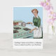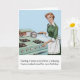 Image vintage d'une ménagère rétro des années 1950 ou 1960. Elle est debout devant son poêle turquoise, portant une robe et un tablier, et tenant une petite casserole sur un des brûleurs du poêle. Elle sourit doucement, se tourne et dit à son mari : "Chérie, je sais que vous aimeriez un repas maison et relaxant pour votre anniversaire." A l'intérieur de la carte : "J'ai appelé ta mère."