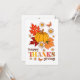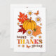 Carte de voeux de style super rétro. Elégante typographie rétro "Bon thanksgiving", avec des fleurs marguerites mignonnes, papillons, feuilles d'automne et un citrouille. La carte comprend un merveilleux message de bienvenue à l'arrière qui peut être personnalisé.