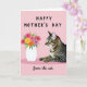 Designed with a soft rose background, the front blends a flat illustrated bouquet with a more lifelike lounging tabby cat, creating a sweet little contrast that feels like a quiet gift being offered ❤️. Across the top, “HAPPY MOTHER’S DAY” sits centered in dark, sans‑serif letters that stand out clearly against the pale backdrop. On the left, a white vase holds simplified flowers in fuchsia, yellow, orange, and light lavender, with crisp green leaves fanning outward like a cheerful hello 🌼. On the right, the striped cat stretches out in warm browns, deep gray, and black, its fur shown with fine detail that makes it look soft to the touch. The cat’s bright green eyes angle toward the bouquet, as if admiring it with a tender, slightly mischievous glance. Near the bottom, smaller dark text reads “from the cat.” and is placed low and slightly to one side, like a note added at the last second. The scene stays uncluttered, with the vase and flowers balancing the relaxed cat against the open pink space above and around them. The final touch is the cat’s curled tail and the vase’s simple silhouette set against the smooth, uniform rose background.