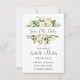 Cette conception présente une illustration de roses blanches avec un feuillage coloré et éclatant en aquarelle. Le texte "Enregistrer la date" est écrit dans un Script.