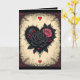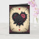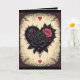 Un cœur noir d'encre, gras et gothique, bordé d'une délicate garniture. Deux roses sont nichées à l'intérieur de ce cœur. De minuscules boutons rouges et des feuilles sombres se déversent autour d'eux, créant un contraste dramatique avec la douceur des pétales. L'ambiance générale est richement romantique avec une touche sombre et aigre-douce. Une bordure ornée encadre le tout : des vignes enroulées, des filigranes épineux et des fioritures symétriques dans les coins en rouge foncé et noir qui semblent à la fois décoratifs et légèrement menaçants. De petits cœurs rouges ponctuent le design au-dessus et en dessous du motif central.