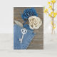 Roses Denim en poche jean bleu avec clé antique sur bois de grange rustique.