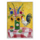 un coq sur une nappe rouge de contrôle avec un boquet de fleur dans une boîte en fer blanc d'huile d'olive comme vase.