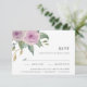 Une carte RSVP florale élégante dans les tons muets de violet violet et de vert sauge présente une poitrine florale d'aquarelle dans le coin supérieur gauche, avec la date RSVP souhaitée, accepter et refuser le libellé dans le lettrage classique hors noir. Personnalisez avec vos sélections de plats ou de repas sous vos yeux.
