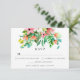 Cette jolie carte à fleurs tropicales RSVP présente un luxuriant bouquet tropical de fleurs d'aquarelle et de verdure. La carte florale RSVP comprend des coraux et des fleurs roses avec des feuilles tropicaux vert émeraude. La couleur au dos de la carte est modifiable (en bleu turquoise). La papeterie mariage correspondante est disponible dans notre collection Tropical Floral mariage.