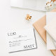 Cette carte RSVP moderne en noir et blanc présente une typographie audacieuse et un agencement minimaliste, parfait pour les couples qui projettent un mariage élégant, contemporain ou à cravate noire. Avec de l'espace pour répondre et noter le nombre de participants, cette carte garde votre suite papeterie élégante et rationalisée. Idéal pour jumeler avec des invitations modernes ou monochromes. Coordonné avec la papeterie mariage noir et blanc correspondant.