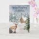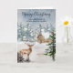 Joyeux Noël pour godson et sa carte de famille avec cabine d'aquarelle d'hiver rustique dans une forêt enneigée et cerf.