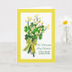 Stems of yellow from a flowering shrub, pussy willows, and shamrocks held together with a faux (not real) bow of yellow, green, and white. Floral card pour St. Patrick's Day for a godmother. Art, image, and verse © Shoaff Ballanger Studios, 2021.