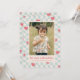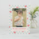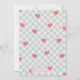 Une carte festive de la Saint-Valentin aux coeurs roses éparpillée sur un damier bleu clair. Le message et l'information du client sont placés sous une grande photo, et le dos de la carte comporte un motif de coordination.