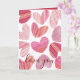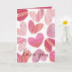 Carte de la Saint-Valentin moderne. Présentant de nombreux cœurs créés à l'aquarelle dans une gamme de rouges à rose pâle sur fond blanc avec une texture d'éclaboussure d'aquarelle. À l'intérieur de cette carte se trouve un grand cœur avec du texte sur fond rouge. Facile à éditer avec votre nom.