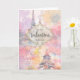 Carte féminine et romantique de la Saint-Valentin aux couleurs pastel douces avec un collage représentant la Tour Eiffel, des fleurs, des feuilles et d'autres marques d'aquarelle.
