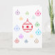 Des ornements de globe ronds colorés avec des bandes centrales montrant des éclats d'étoiles, sont en différentes tailles, couvrant cette carte avec un arrière - plan blanc. A l'intérieur, vous pouvez personnaliser le texte qui dit "Joyeuses fêtes - Je vous souhaite du bonheur pour le Nouvel An !" Dans le coin supérieur droit se trouvent trois autres globes ornementales en bleu, vert et rouge.