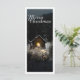 La carte montre une scène hivernale d'ambiance avec une petite cabane en bois éclairée au milieu d'une forêt enneigée. La source de lumière chaude à l'intérieur crée un beau contraste avec l'environnement sombre et paisible. L'élégante lettrage "Joyeux Noël" en blanc donne au motif une touche festive. 🎄 ✨