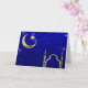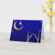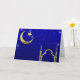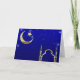 Carte Ramadan avec mosquée et flèches dorées, lune et étoile contre arrière - plan étoilé bleu foncé.