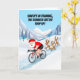 This festive Christmas card showcases Santa Claus speeding down a snowy hill on a candy cane striped bike, with his cheerful reindeer racing close behind. It’s the perfect holiday design for cyclists, bike riders, and anyone who loves a fun and active Christmas season.